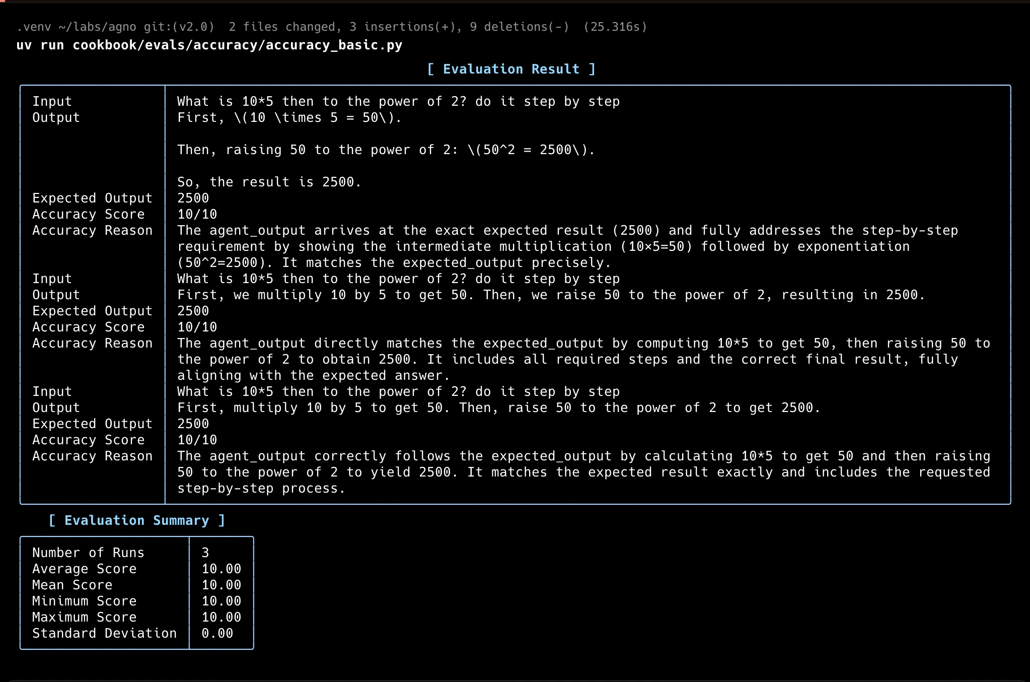 In this example, theAccuracyEval will run the Agent with the input, then use a different model (o4-mini) to score the Agent’s response according to the guidelines provided.